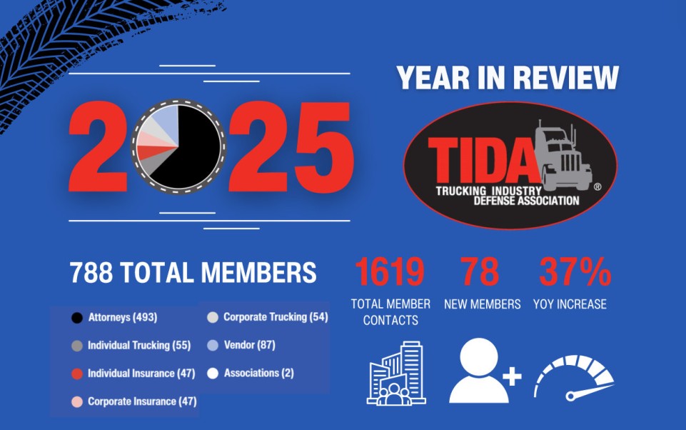 The Trucking Industry Defense Association (TIDA) is a growing, highly dynamic organization founded in 1993. Today, our 1,500+ members throughout the United States and Canada remain committed to engaging in actions and activities that reduce loss costs to the trucking industry. We accomplish this through education, resources, and, above all, by maintaining a membership of attorneys and trucking and insurance industry representatives that possess the knowledge, skill, and capacity to provide extraordinary support to one another.